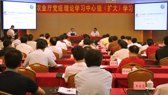 今天(7月26日),省农业厅召开为期一天的党组理论学习中心组(扩大)学习会议,邀请华南农业大学王浩副校长、省农科院科技情报所郑业鲁所长讲授《发达国家工业反哺农业的经验和启示》和《世界现代农业发展的主要特点和趋势》。省农业厅党组成员、各处室、事业单位负责人,各地级以上市农业局局长等参加了学习会。省农业厅厅长谢悦新、副厅长余俭娥分别主持了上、下午的学习会。