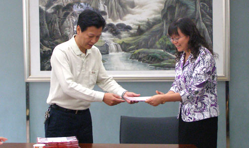 图为省农业厅林果先副厅长(左)向农产品质量监督检测专业技术委员会专家颁发聘书