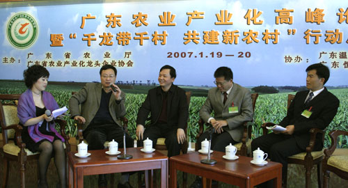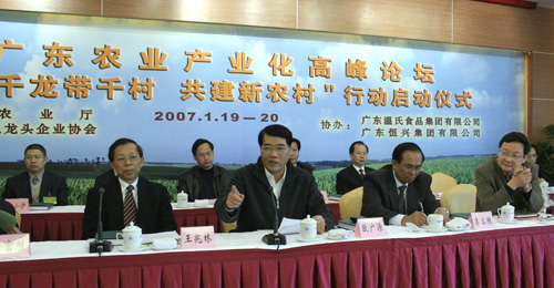 今天(1月19日)上午,由广东省农业厅和省农业产业化龙头企业协会联合举办的广东农业产业化高峰论坛暨“千龙带千村,共建新农村”行动启动仪式在广州拉开序幕。论坛以“推进农业产业化,建设和谐新农村”为主题,围绕国家扶持农业产业化有关政策,龙头企业融资问题、核心竞争力培育、出口创汇能力提升以及参与新农村建设等议题,开展政企、银企对话,探讨发展推进农业产业化,建设和谐新农村的有效途径。