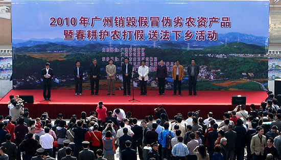 3月18日上午,广东省农业厅、广州市农业局在广州市白云区钟落潭镇联合举行销毁伪劣假冒农资暨春耕护农送法下乡活动。省、市、区农业、工商、质监等部门有关行政执法和技术人员,省内30多家农药、肥料、种子、饲料、兽药的名优企业代表参加了此次活动。省农业厅副厅长林果先出席活动并讲话。