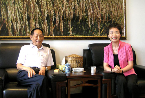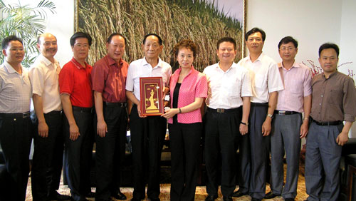 6月30日,省农业厅程萍副厅长带领厅科教处、省水稻产业创新团队有关专家和超级杂交稻高产示范工程示范点——珠海市农业局有关领导一行,顶着高温酷暑,来到位于湖南长沙的国家杂交水稻工程技术研究中心,登门拜访了湖南省政协副主席、中国工程院院士、国家杂交水稻工程技术研究中心主任袁隆平先生,亲自汇报了上半年广东省超级杂交稻高产示范工程项目的组织实施情况和下半年的工作计划。袁院士热情接见了程萍副厅长一行,召集有关专家对项目实施进行了座谈。