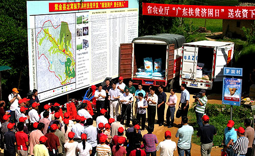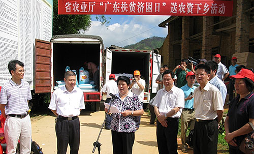 根据省委、省政府开展“广东扶贫济困日”活动的统一部署,6月30日下午,省农业厅组织落实送农资下乡车队3辆车,组织干部职工20多人,到中山纪念堂广场参加“广东扶贫济困日”活动启动仪式。送农资下乡活动,是全省开展“广东扶贫济困日”活动的一部分,是省扶贫济困日活动办统一组织的五个下乡车队之一。“广东扶贫济困日”活动启动仪式一结束,送农资下乡车队就马不停蹄,立即赶赴省农业厅“双到”扶贫村——紫金县龙窝镇罗洞村,开展送农资下乡活动。