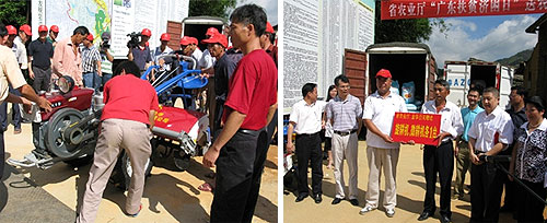 7月1日,罗洞村的村民们早早就集中在村委门前,兴高采烈等待送农资车队的到来。受谢悦新厅长的委托,省纪委、监察厅派驻机构正厅级纪检员、监察专员、省农业厅机关党委书记张小沙同志和厅党组成员、副厅长蔡泽辉同志,带领厅机关党委专职副书记陆国煌、厅工会专职副主席王绍瑾等同志,以及装满农机具、化肥的3辆运送农资下乡车队,奔赴罗洞村,拉开了“省农业厅‘广东扶贫济困日’送农资下乡活动”序幕。送农资下乡活动由紫金县副县长刘秋满同志主持,张小沙同志代表省农业厅作了讲话。此次活动,省农业厅土肥总站捐赠5吨复合肥,深圳芭田生态工程股份有限公司、广东拉多美化肥有限公司各捐赠2.5吨复合肥,厅农机化办和东莞市金华机械设备有限公司、深圳市富巍盛科技有限公司、博罗县东田实业有限公司捐赠了1台旋耕机,1台微耕机,30台太阳能杀虫灯和10台喷雾器,这批肥料和农机具折合价值大约18万元。村党支部书记代表村民对各级党委、政府特别是省农业厅给予罗洞村的关心和帮助表示衷心的感谢,并表示一定会努力带领村民勤劳致富,不辜负上级领导的期望。