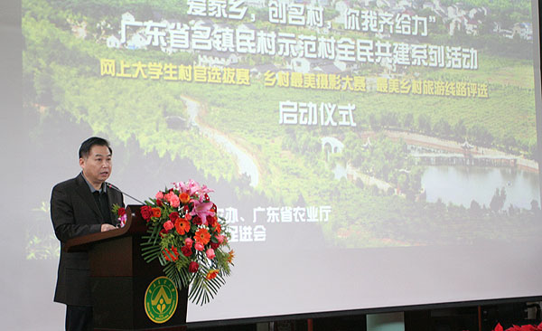 2012年1月5日上午,由中共广东省委农办、广东省农业厅和省教育促进会联合主办的“爱家乡,创名村,你我齐给力”广东省名镇名村示范村全民共建系列活动暨“网上大学生村官选拔赛”、“乡村美景摄影大赛”、“最佳乡村旅游线路推选”活动在华南农业大学正式启动。省农业厅、省教育促进会、广州部分高校团委、学生会负责人、学生等300余人参加了启动仪式。