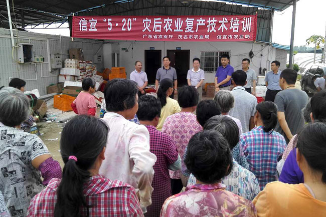 5月22日,广东省农业厅黄斌民副厅长带领种植、畜牧处室的领导和专家到茂名市开展指导救灾复产工作。针对重灾区信宜市农牧业灾后复产遇到急需解决的问题,黄斌民副厅长立即指示陆国煌总农艺师带领省级种植业、动物防疫等方面专家,会同茂名市农业局、信宜市农业局派出专家一起,开展省、市、县三级的水稻、蔬菜、畜禽养殖等现场技术培训。