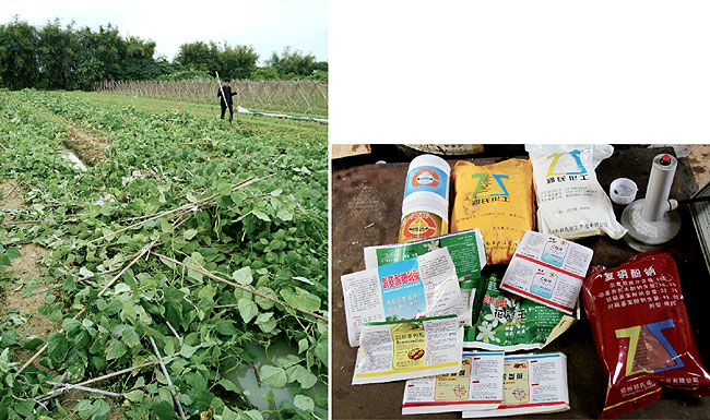 资料图片:铲除有害有毒的四季豆(左)、余某辉生产的假农药(右)