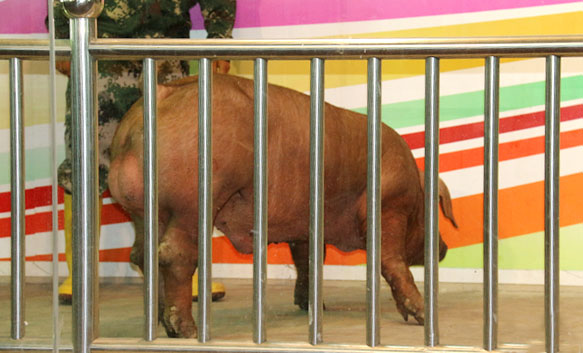 会议最后进行了种猪拍卖活动,将活动气氛推向了高潮。现场来宾热情高涨,投标举牌此起彼伏。最终,经过多轮激烈竞投,来自四会三乐原种猪场耳号为188的杜洛克公猪以17000元的拍卖价成为本届拍卖会的“猪王”。