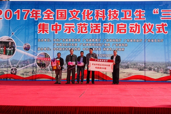在启动仪式上,主办单位向在场的南雄市贫困乡村、中小学校、农科机构、乡村医院等单位代表赠送了科技、农业、文化和卫生等相关物资一批,同时还向现场近500多名群众开展文化宣传、科普展示、派发农业科技丛书、健康检查等多项惠民服务活动。省农业厅陈正辉副巡视员代表农业厅向南雄市农科所赠送200套电动喷雾器和3000册(十一个种类)农业科技丛书,总计价值6万多元。