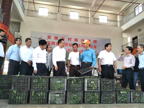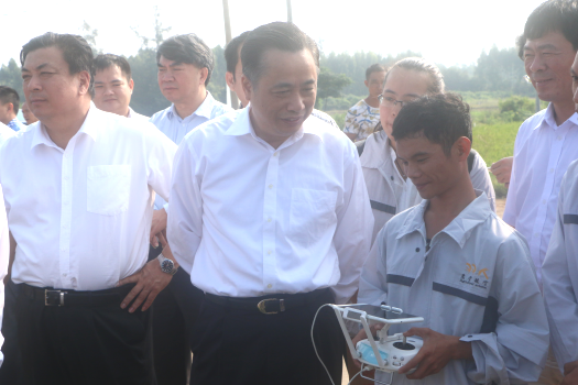10月24日,广东省农业厅党组书记、厅长郑伟仪带队到省农业厅精准扶贫村那毛村调研指导工作。郑伟仪厅长轻车简从、马不停蹄奔往那毛村毛括坑农田现场查看了番薯机械化起垄、栽苗一体化技术和水稻水旱轮作技术示范区,观看了在湛江羽人农业航空服务有限公司工作、也是精准贫困户的莫杨鑫现场操作无人机植保作业示范,亲切询问了其工作情况。