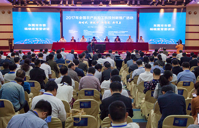 11月1日,由农业部农产品加工局和广东省农业厅联合主办,东莞市农业局、广东省农业科学院蚕业与农产品加工研究所、广东省生物工程研究所(广州甘蔗糖业研究所)、东莞理工学院、省农业展览馆(省农业对外经济促进中心)等单位共同承办的2017年全国农产品加工科技创新推广活动在东莞举行。农业部农产品加工局马洪涛副局长、农业部科教司刘艳巡视员、广东省农业厅郑惠典副厅长、东莞市市委杨晓棠常委、广东省农科院廖森泰书记、肖更生副院长等参加本次活动。活动现场共促成科研单位和生产企业达成科技成果转化或科技合作开发意向204项,组织20个科企合作项目现场签约,签约合同总金额达3.2亿元。