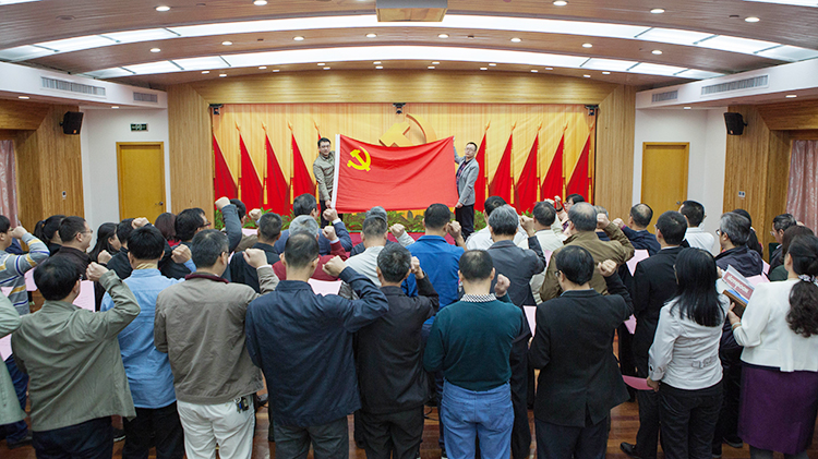 最后,参加学习会的全体党员干部面对鲜红的党旗,重温了入党誓词。