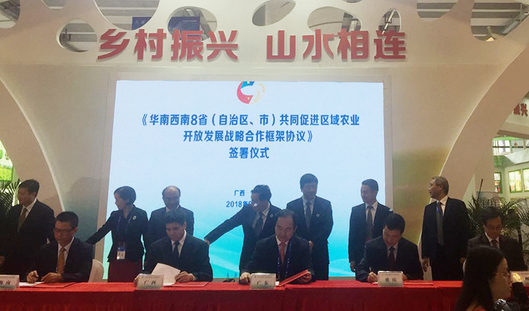 2018年9月11-13日,广东省农业厅陈东副厅长(正厅职)率团赴广西南宁参加第15届中国-东盟博览会农业系列活动。陈东副厅长代表广东省农业厅与华南西南7省(自治区、市)农业部门领导共同签署了《华南西南8省(自治区、市)共同促进区域农业开放发展战略合作框架协议》。代表团参加了第15届中国-东盟博览会“南向通道”农产品流通对接会、第三届中国-东盟农业合作论坛和“一带一路”农业投资合作论坛等,并与企业代表调研了广西金穗农业集团、广西彩港农业有限公司,就粤桂农业企业共谋发展进行了务实对接。