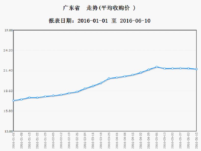 据对全省101家规模以上生猪定点屠宰样本企业监测统计,2016年6月6-12日,生猪平均收购价格为21.61元/公斤,较前一周下降0.46%,较去年同期上涨37.73%。本周较上周环比降幅较大的地区有阳江市2.36%,汕头市1.85%,梅州市1.43%。
