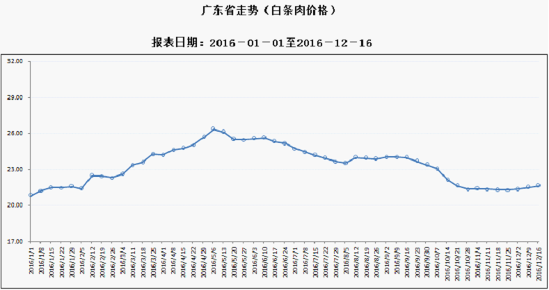据对全省53家规模以上生猪定点屠宰样本企业监测统计,2016年12月12-18日,生猪平均收购价格为17.62元/公斤,较前一周上涨0.46%,较去年同期下降0.62%。本周较上周环比涨幅较大的地区有梅州市3.37%,潮州市3.29%,汕头市2.25%。