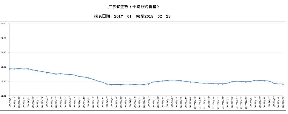 据对全省53家规模以上生猪定点屠宰样本企业监测统计,2018年2月17-23日,生猪平均收购价格为15.30元/公斤,较前一周下降0.13%,较去年同期下降13.85%。本周较上周环比降幅较大的地区有阳江市1.93%,东莞市1.23%,汕头市1.19%,但仍有5个市呈上涨态势,其中深圳涨幅超过7%。
