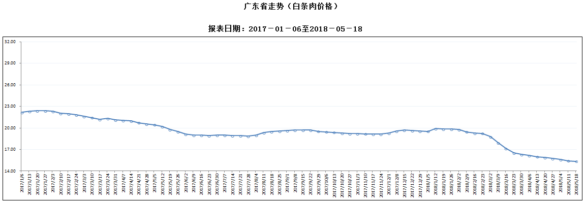 广东省屠宰生猪及肉品价格周报(2018年第20周)生猪及猪肉价格环比、同比均下降