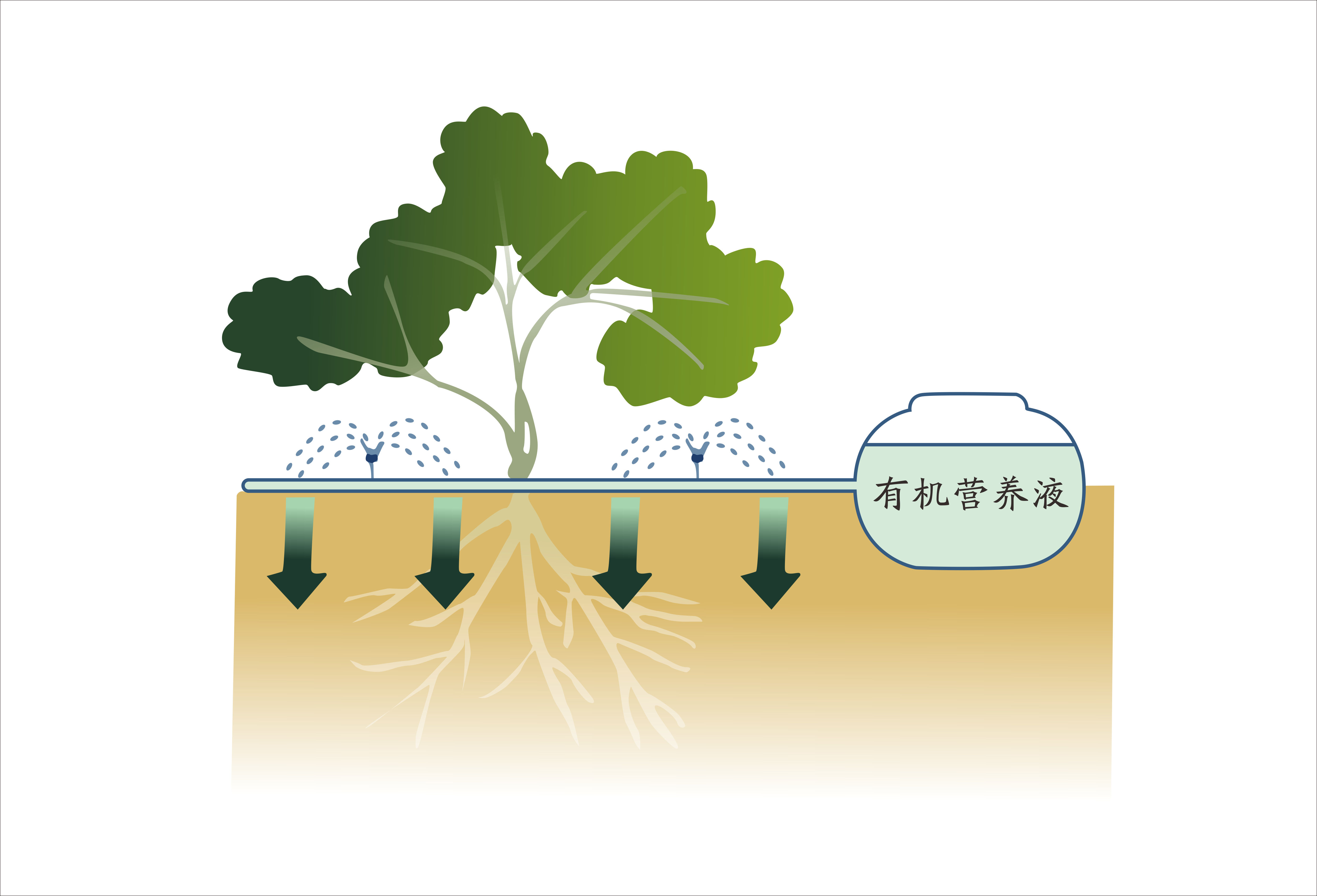 全水溶的有机营养液肥通过灌溉设施进行滴灌和微喷灌施肥,在作物苗期采用400-500倍稀释液滴灌或1000-1200倍稀释液叶面喷施,在作物快速生长时期采用200-300倍滴灌或800-1000倍叶面喷施,可显著提高水肥资源利用效率,较常规施肥方法节省肥料15%-20%。