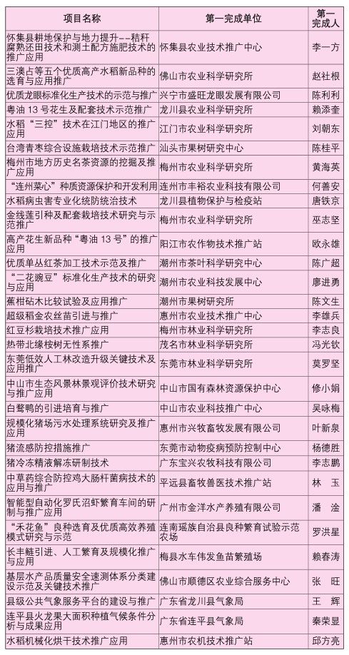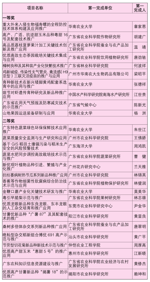 2015年11月11日,经广东省农业技术推广奖评审委员会评审,评出2014年度广东省农业技术推广奖拟奖项目共88项,其中一等奖项目10项,二等奖项目36项,三等奖项目42项。现对拟奖项目进行公示,并在2015年11月13日《南方日报》A09版同步进行公示。如有异议,请在公示之日起一个月内向广东省农业技术推广奖评审委员会办公室提出书面意见。