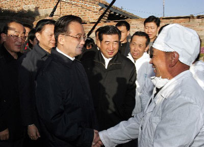 这是温家宝在黑山县镇安乡营房村防治高致病性禽流感医疗站看望医疗、防疫人员