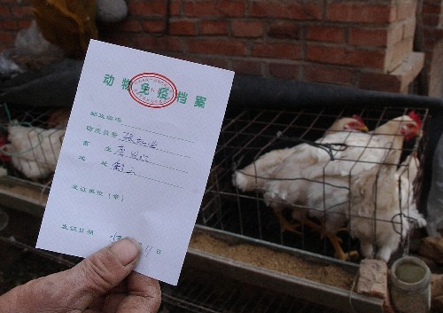 养鸡专业村积极防控禽流感 西彩石村为经过免疫的家禽发放《动物免疫档案》( 11月14日摄)。 西彩石村是一个养鸡专业村,该村活鸡存栏近10万只,200只以上养殖规模的专业户有200多家。为了防控禽流感,该村在防疫部门的指导下,从10月下旬开始清点家禽数目,对鸡舍进行消毒,为家禽注射疫苗,并安排乡村疫情检测员对本村疫情形势进行检测和上报。目前,西彩石村规模化养殖的鸡都已注射疫苗,散养的1000多只鸡也开始注射疫苗,一个全面、有效的禽流感防控网在这里形成。