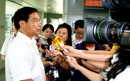 刚参加完省农业厅上线“民声热线”首期节目的陈福林被记者围住询问猪价问题 摄影:李华勇