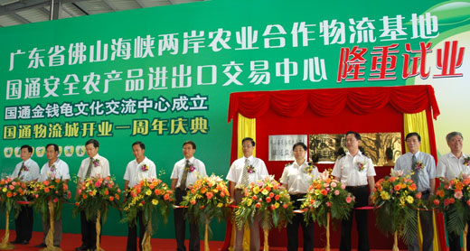 8月9日上午,佛山海峡两岸农业合作物流基地广东省国通安全农产品进出口交易中心在佛山市陈村镇正式试业。陈村镇人民政府和广东国通物流城联手举办了佛山海峡两岸农业合作物流基地国通安全农产品进出口交易中心试业典礼暨广东国通物流城开业一周年大型庆典。庆典同时还举行了佛山市海关驻顺德办事处国通监管科、顺德出入境检验检疫局陈村办事处、陈村出入境货运车辆检查场的三大揭牌仪式,省农业厅陈福林副厅长参加了揭牌仪式。