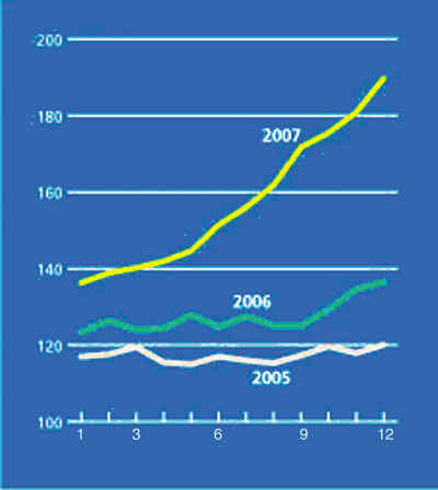 任彦(本报驻印度记者):印度大米的价格如今是一路猛涨,1公斤大米的价格已由原来的20卢比(1美元约合40卢比)涨到现在的40卢比;小麦的供应情况更糟,去年下半年,印度已经开始进口小麦。印度著名经济学家潘南第卡在接受记者采访时表示,“我们过去一直对6000万吨的粮食储备感到沾沾自喜,但现在储备粮仓快被掏空了,只剩下不到1800万吨。”