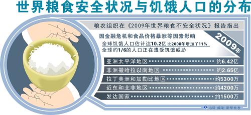 尽管国际社会为消除饥饿作出了努力,近年来全球饥民数量却持续增长,而且这一状况因为全球金融危机发生而进一步加剧。据粮农组织估计,今年全球饥饿和营养不良人口首次突破10亿,达到10.2亿,每6秒钟就有一名儿童因饥饿或相关疾病死去。