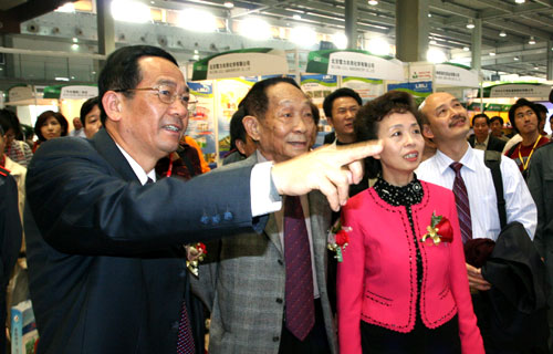 “中国杂交水稻之父”袁隆平院士(中)在谢悦新厅长等人的陪同下参观展览现场