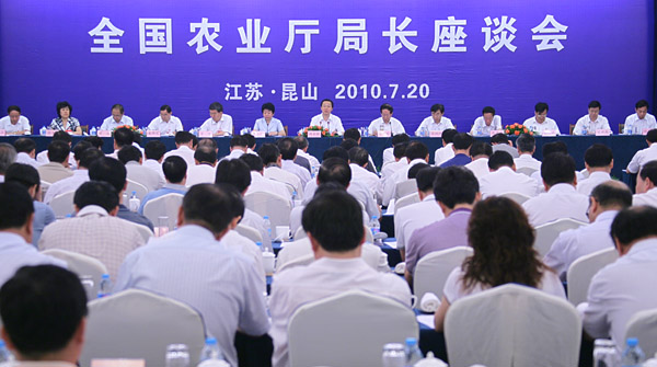 7月19-20日,全国农业厅局长座谈会在江苏昆山召开。会议传达学习了中共中央政治局委员、国务院副总理回良玉对当前农业和农村经济工作的重要指示精神,分析当前农业农村形势,总结交流上半年工作,部署下半年重点工作,研究“十二五”农业农村经济发展重大问题。回良玉近期指出,今年上半年,夏粮丰收,农民增收,农业形势很好,超出预期。今年气候极为异常,灾情极为严峻,任务极为繁重,取得成绩极为不易。下半年要再接再厉,抓好夏管,抗灾减灾,夺取秋粮好收成;同时抓好畜牧业、乳业、水产品、乡企发展,丰富菜篮子、肉蛋奶、各种食品供应;千方百计促进全年农民收入有较多增加、较快增长;农业部门要发挥好职能作用,抓好“十二五”规划;研究重大和深层次问题,确保全年农业发展目标的实现。农业部部长韩长赋出席会议并讲话。韩长赋强调,回良玉副总理的重要指示,针对性、指导性很强,指明了今年下半年农业农村经济工作的重点、要点,各级农业部门要认真学习,深刻领会,贯彻落实。