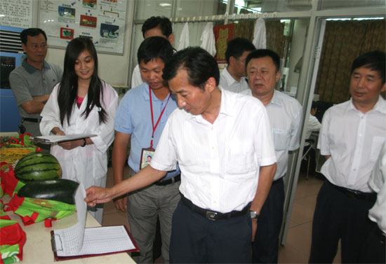 今天(7月23日)下午,农业部副部长陈晓华一行在广东省农业厅厅长谢悦新、副厅长林果先、广州市副市长陈国及相关农业部门负责人的陪同下,就亚运会农产品质量安全保障工作考察了广州市农业标准与监测中心和广州市江南农产品批发市场。