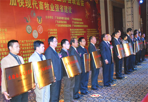 联谊会上还举行了农业部畜禽养殖标准化示范场和广东省第三批100家重点养猪场授牌仪式。全国政协常委、中国畜牧业协会会长张宝文,广东省副省长刘昆,省政府党组成员、省扶贫开发领导小组副组长李容根,农业部国家首席兽医师于康震,省政府副秘书长颜学亮,省农业厅厅长、省委农村工作办公室主任谢悦新,农业部畜牧业司巡视员陈伟生等为上述单位的代表授牌并合影留念。
