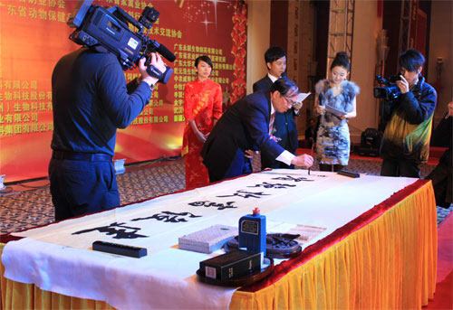 联谊会上,省政府党组成员、省扶贫开发领导小组副组长李容根的即席挥毫,给与会代表留下了深刻的印象,李副省长分管农业工作多年,他怀着对“三农”的真挚感情,以饱满的笔触书写了一幅“建设畜牧强省”大字。六个大字凝聚了这次联谊会的主题,表达了奋斗在畜牧战线广大从业人员的雄心壮志,它将激励广东畜牧人朝着这个目标努力迈进。