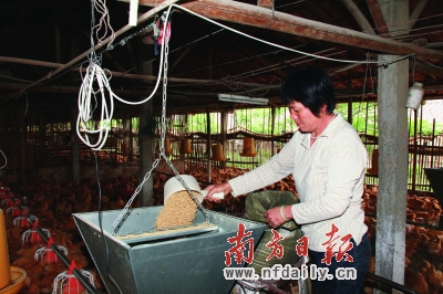 最近,云浮新兴县稔村镇村民彭木应的生活发生了新变化:不久前,她在温氏集团的帮助下引进了自动喂料系统(如图),鸡舍从2个扩大到3个,养鸡的数量从以前的每批1万多只提高到2万只,鸡场需要的人工从3人减少到2人。她告诉记者,使用自动喂料系统等自动化机械设备,她能够饲养的鸡只大大增多,收入也将大幅提高。