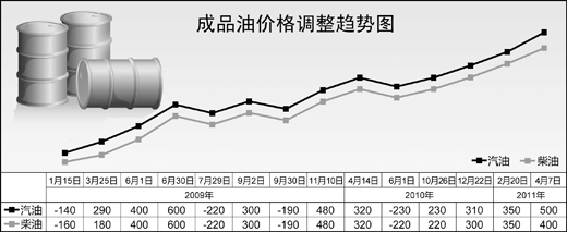 国家发改委发出通知,决定自4月7日零时起将汽、柴油价格每吨分别提高500元和400元,全国平均90号汽油和0号柴油每升分别提高0.37元和0.34元。这是年内第二次调整成品油价格。据国家发改委有关负责人介绍,如果按当前国际市场价格和现行成品油价格机制调整国内成品油价格,提价幅度要大大超过这次调整的水平。为最大程度地缓解对价格总水平的影响,减轻用油行业成本增支压力,国家进一步压缩成品油价格调整幅度,加大了企业自行消化的比例,并适当推迟了调价时间。
