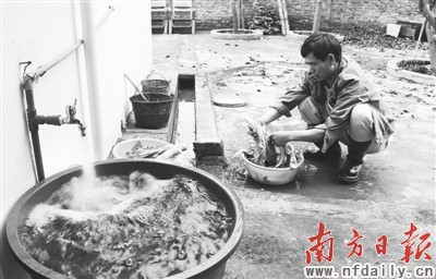 曲江白土镇大村每家每户都用上自来水,图为村民李伟泉用自来水洗菜。粤水轩 陈清浩 摄