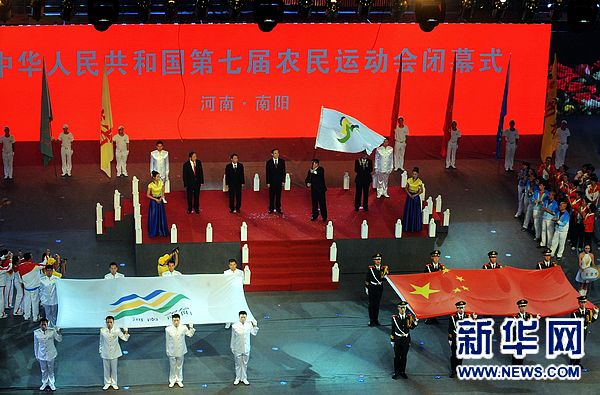 9月22日,为期七天的第七届全国农民运动会,随着农业部副部长余欣荣宣布闭幕,圆满地、胜利地在河南南阳体育馆落下帷幕。全部15大项、198个小项的比赛圆满结束。包括台湾省农民体育代表团在内来自全国各省(区、市)的运动员、教练员共4680人参加了本届农运会。闭幕式上,河南省副省长刘满仓致欢送词,国家体育总局副局长冯建中致闭幕词。接着举行了会旗交接仪式,余欣荣从刘满仓手中接过农运会会旗,交给下一届农运会承办单位领导、吉林省副省长王化文,全场顿时报以热烈掌声。第八届全国农运会将于2016年在吉林省松原市举行。