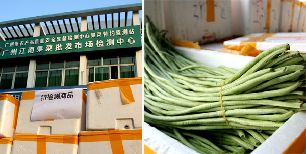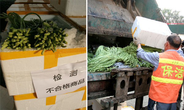 下午3点半,广州市农产品质量安全监督检测中心果菜特约监测站下,几个搬运工正忙碌的将一箱箱封存的农药残留超标豇豆拆箱,倾倒到垃圾压缩车里进行现场销毁。这些豇豆依然新鲜翠嫩,看似与市场上销售的并无二样。但就在昨天,这批次来自海南省三亚市崖城镇的豇豆经广州市农产品质量安全监督所定性定量检测,确认有4个样品农药残留量不合格。
