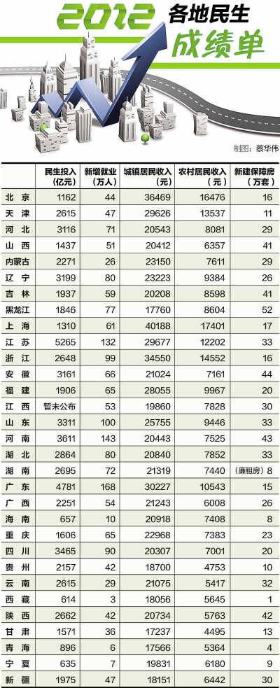 数据表明,2012年,全国31个省(区)市的财政支出中,民生支出普遍增长,且多数地方占到了当地公共财政支出的50%以上。