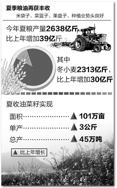 面对春季东北低温春涝、西南西北干旱、冬麦区“倒春寒”等多种灾害的严峻考验,全国种植业生产继续保持良好发展势头。农业部组织开展了“东北抗春涝保春播”、“西北西南抗旱促春管保春播”和“长江中下游水稻集中育秧促增产”三大攻坚战,强化关键农时农机作业,推动粮食生产扎实开展。夏粮再次增产,早稻丰收有望,秋粮面积增加,长势普遍较好。油料、糖料生产保持稳定,棉花苗情长势较好,蔬菜、水果等“菜篮子”产品供应充足。