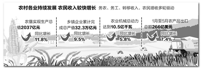 农业农村经济平稳发展,家庭经营收入保持增长势头。上半年农民家庭经营收入达到2434元,同比增长7.6%。这与国家继续提高稻谷、小麦最低收购价格关系密切。同时,各地大力发展农村二三产业,加快推进农业产业化经营,促进农产品精深加工,预计规模以上农产品加工业增加值同比增长9.7%。