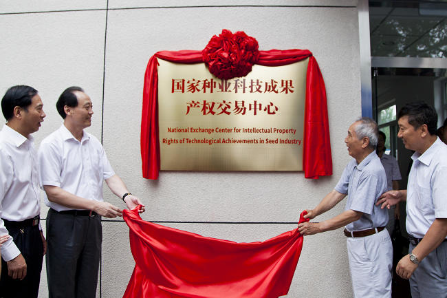 8月13日,农业部副部长余欣荣、中国农业大学戴景瑞院士、中国农业科学院党组书记陈萌山、农业部种子管理局局长张延秋共同为国家种业科技成果产权交易中心揭牌。