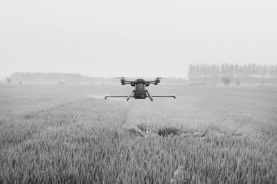 在示范现场,“千村飞防”的航空植保无人机在水稻上进行植保作业演示。