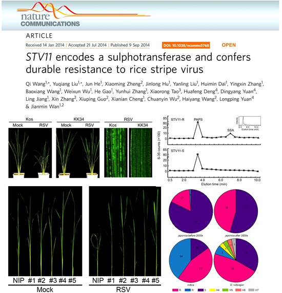 农业部网讯 中国农业科学院作物科学研究所万建民研究团队近日在国际上首次成功克隆水稻抗条纹叶枯病基因,选育出系列抗条纹叶枯病高产优质水稻新品种,有效解决了我国南方粳稻区受条纹叶枯病危害的难题。相关研究成果在线发表于最新一期《Nature Communications》。