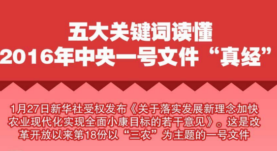 新华社27日受权发布《关于落实发展新理念加快农业现代化实现全面小康目标的若干意见》。这是改革开放以来第18份以“三农”为主题的一号文件,也是自2004年以来,中央一号文件连续第13次聚焦“三农”。新华社27日受权发布《关于落实发展新理念加快农业现代化实现全面小康目标的若干意见》。这是改革开放以来第18份以“三农”为主题的一号文件,也是自2004年以来,中央一号文件连续第13次聚焦“三农”。