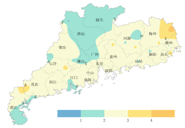 上周(11月27日~12月3日),全省平均气温19.0℃,较常年同期显著偏高2.3℃,西北大部、中部局部、雷州半岛地区偏高0.9~2℃,其余大部分地区偏高2~4.3℃(图1)。平均日照时数27.3小时,较常年同期偏少近3成。平均累积降水量1.8毫米,较常年同期偏少8成,除西北、西南局地降水较常年正常~偏多9成以外,其余大部分地区降水偏少2成~1倍(图2),其中,37%的站点周内无降水。目前,全省荔枝、龙眼处于控梢期,春植蕉处于营养生长期,甘蔗处于收获期,秋花生收晒已接近尾声。晴好天气利于冬种蔬菜生长、甘蔗糖分累积及蕉柑柑果膨大,但周内降水偏少,对无灌溉设施的在田作物生长及水库蓄水有不利影响。