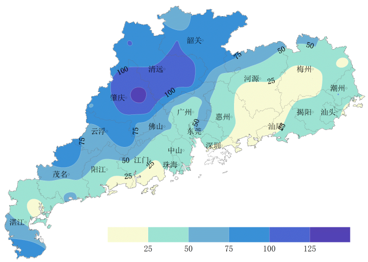 日照:全省平均月日照时数84.7小时,较常年同期偏少5成。月日照时数分布:西北、西南局部、肇庆大部35.5~70小时,东南大部90~114.7小时,其余大部分地区70~90小时。与常年同期相比东南大部偏少2~5成,其余大部分地区偏少5~8成。