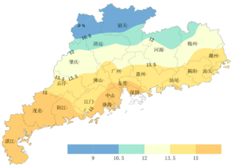 气温:全省月平均气温13.7℃,较常年同期偏高0.3℃。月平均气温分布(图1):西北偏北地区9.0~10.5℃,西南、东莞局部、深圳大部15.0~16.9℃,其余大部分地区10.5~15.0℃,与常年同期相比,南部沿海局部地区偏低0.2~0.6℃,其余大部分地区正常~偏高1.3℃。月极端最低气温大部分地区出现在11~13日或29~30日,北部的仁化、连山、连州和南雄-1.4~-0.6℃,西南大部、东南沿海4.0~7.5℃,其余大部分地区1.0~4.0℃。