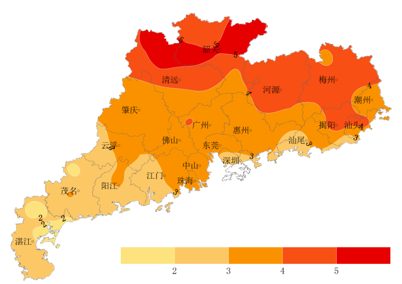 目前广东省早稻大部分地区处于拔节普遍期~末期,徐闻、梅县进度较快,已进入孕穗普遍期;花生为下针普遍期;荔枝、龙眼处于果实发育期;柑橘、沙田柚为幼果膨大期。上周全省气温显著偏高、日照显著偏多、降水明显偏少,周内温高光足,利于早稻及其他作物生长,降水稀少利于早稻排水晒田、控制无效分蘖;虽然大部无降水,但前期外部水源充足,对灌溉影响不大。周内主要农事活动有早稻拔节期肥水管理、作物病虫害防治、喷药施肥、田间除草等。根据气象干旱监测显示,目前气象干旱略有抬头,全省轻旱站点24个(主要集中在北部和东南部)、中旱站点4个(图3)。