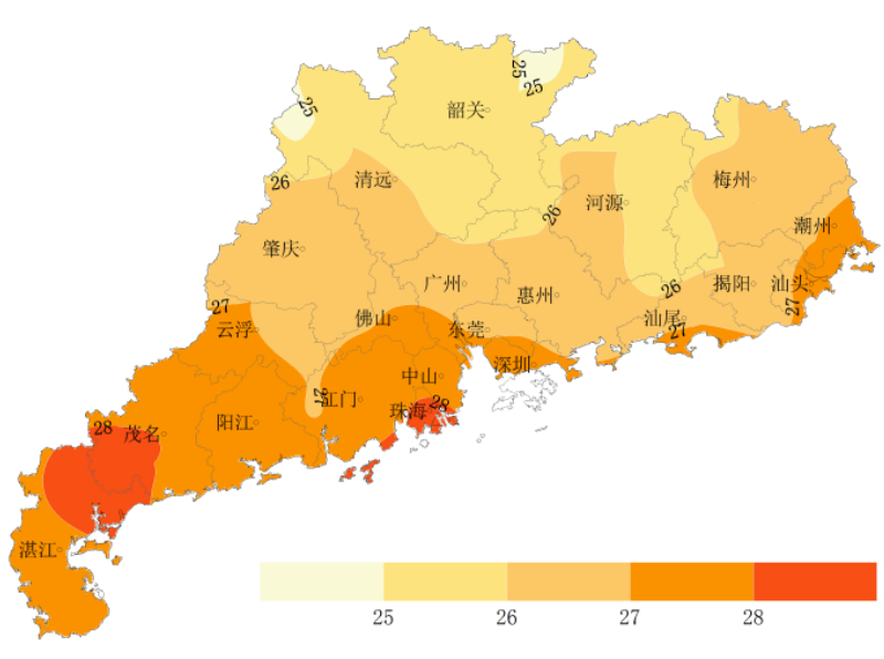 上周(6月4~10日),全省平均气温26.8℃,较常年同期偏高0.2℃,西南、中部局部、东南沿海地区27.0~28.6℃,其余大部分地区24.9~27.0℃(图1),与常年同期相比,西南大部、中部局部和东部局部正常到偏高1.9℃,其余大部分地区正常到偏低1.3℃;全省平均累计降水量220.5毫米,较常年同期显著偏多1.6倍,其中西南、中部、东南局部300~478.6毫米(其中26个站点降水量破历史同期最高),西北、中部偏西、和茂名、潮州大部24.6~100毫米,其余大部分地区100~300毫米(图2),与常年同期相比,雷州半岛、中部局部、西北局部、东南局部地区偏多2~4倍(徐闻偏多7.2倍),茂名、肇庆、清远、潮州局部地区正常到偏少近7成,其余大部分地区正常到偏多2倍;全省平均累计日照时数20.9小时,较常年同期偏少3成,西南、中部局部、西北局部、东南局部地区20.0~44.1小时,其余大部7.8~20.0小时。